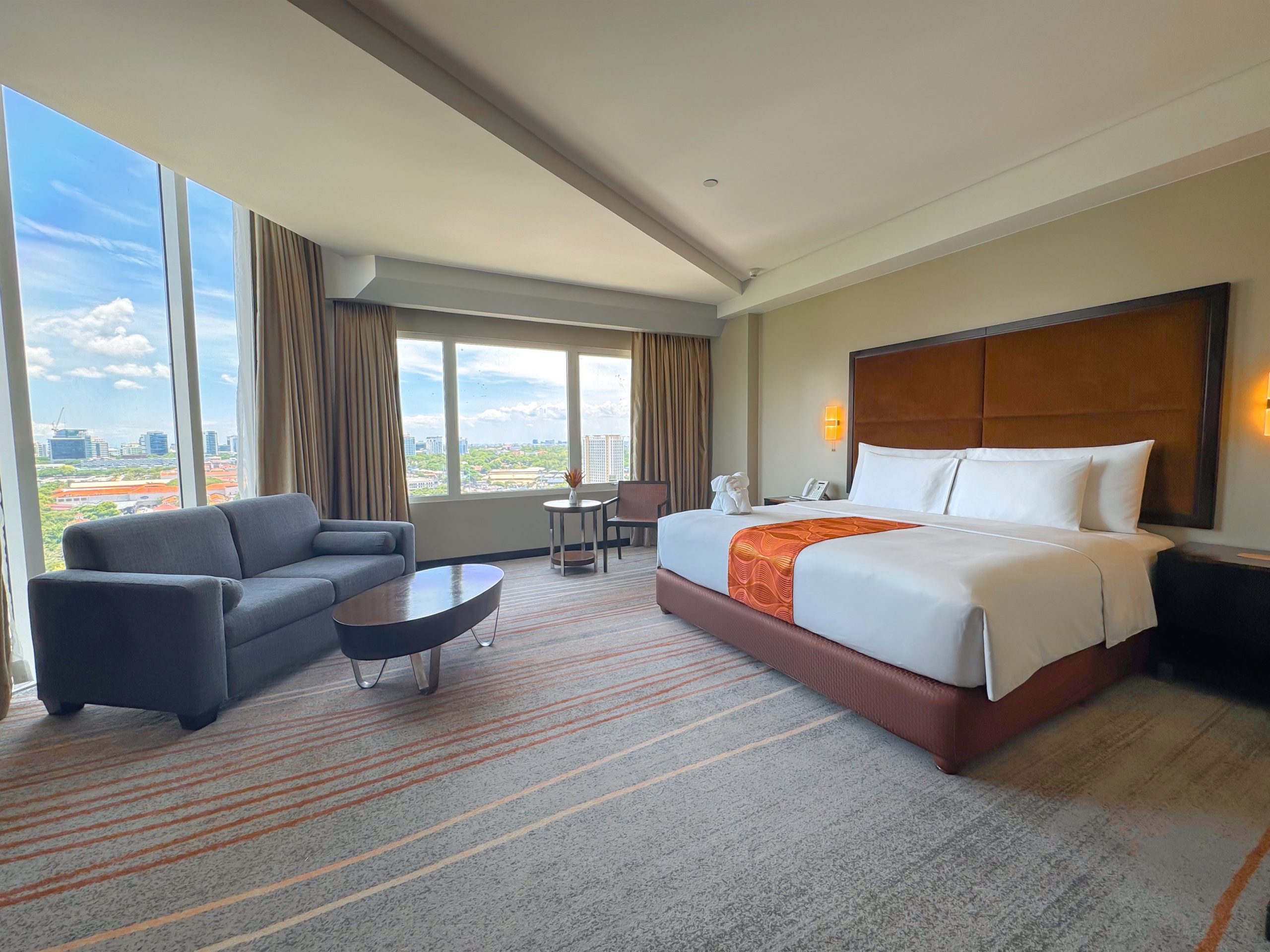 These strategically located corner suites offer a spacious living area. At 43 sq. m, it has ample space to move around and floor-to-ceiling glass windows to view the city.